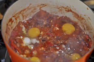 3. Now use a spoon to create 4 wells in the pan.  Into these crack your eggs as speedily as you can so they all get roughly the same amount of time to cook. Place the lid on the pan and leave to stew for around 4-5minutes, depending on how runny you like your eggs.