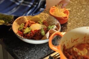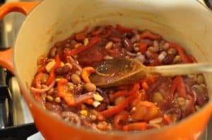 2. Add the tinned tomatoes, the strained beans and the chilli.  Place the lid on the pan and leave to gently simmer for another 5-10 minutes. Now would be a good time to check out our little herb garden.  If it’s growing I would recommend corriander or parsley to add into the pan.  If your have some cumin or paprika, this is a great addition too. When the stew is adequately reduced it should be thick and flavoursome.