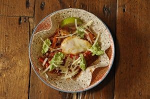 6. Serve the dish by placing the tortillas first onto a plate or bowl.  Spoon on an egg and the tomato stew.  Next add a sprinkling of cheese and a dollop of avocado.  Enjoy!